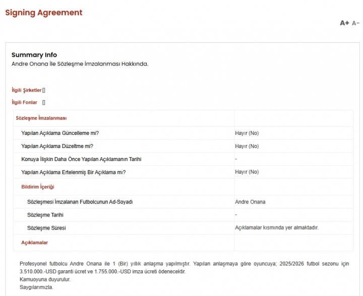官方:奥纳纳租借土超的年薪351万美元,签字费175.5万美元 频道:西甲 日期:2026-01-08 浏览:42 09月12日讯 特拉布宗体育官方宣布,曼联门将奥纳纳租借加盟。据土耳其资本市场委员会(KAP)发布的重大事件披露显示,奥纳纳租借期限为一年,球员基础薪资351万美元,签字费175.5万美元。 上一篇:切尔西官方:已经与欧足联达成和解协议,同意支付罚款 下一篇:BSPORTS-5场LPGA比赛3个冠军 殷若宁比上赛季“又进步了” 相关文章 明天开始,浙BA八强淘汰赛开战,八强赛程出炉! 曼丹达:合作教练中贝尔萨让我感觉最好;和洛里从来没有问题 德天空:格雷茨卡的经纪团队已经和马竞进行了会谈 湖人开始理解哈里森了?东契奇的问题不仅是防守 更在于他的态度